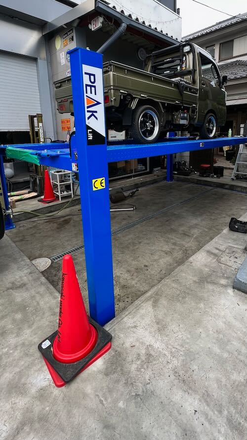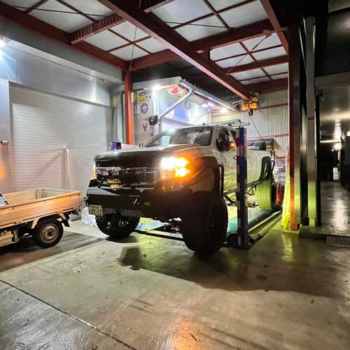 自社工場に5.5t 4柱リフトを導入しスピーディーかつ安全にマフラーの製作や下回り部品の製作・ヒッチメンバーの製作が可能になりました。